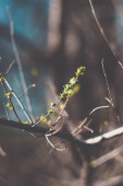Zielone liście kwitną na gałęzi. Wiosna roku. Piękne rozmycie tła. Słońce pada na liście..