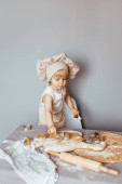 szczęśliwe dziecko w fartuchu i kapelusz szefa kuchni przygotowuje ciasto, piecze ciasteczka w kuchni