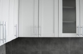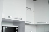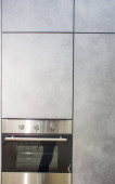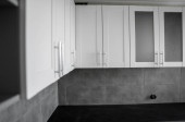 Zdjęcie "Nowoczesne minimalizm stylu wnętrza kuchni w kolorach monochromatycznych. Kuchnia z szarymi białymi elewacjamimdf i ciemnoszarym blatem z zainstalowanym kapturem kuchennym i zlewem. Modułowa kuchnia z płyty wiórowej." może być wykorzystywane do celów osobistych i komercyjnych zgodnie z warunkami zakupionej licencji Royalty-free. Obraz jest dostępny do pobrania w jakości wysokiej rozdzielczości do 5760x3840.