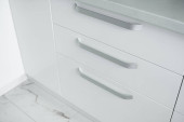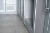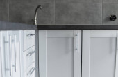 Nowoczesne minimalizm stylu wnętrza kuchni w kolorach monochromatycznych. Kuchnia z szarymi białymi elewacjamimdf i ciemnoszarym blatem z zainstalowanym kapturem kuchennym i zlewem. Modułowa kuchnia z płyty wiórowej.