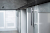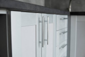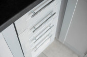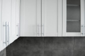 Zdjęcie "Nowoczesne minimalizm stylu wnętrza kuchni w kolorach monochromatycznych. Kuchnia z szarymi białymi elewacjamimdf i ciemnoszarym blatem z zainstalowanym kapturem kuchennym i zlewem. Modułowa kuchnia z płyty wiórowej." może być wykorzystywane do celów osobistych i komercyjnych zgodnie z warunkami zakupionej licencji Royalty-free. Obraz jest dostępny do pobrania w jakości wysokiej rozdzielczości do 5760x3840.