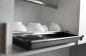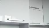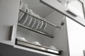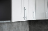 Nowoczesne minimalizm stylu wnętrza kuchni w kolorach monochromatycznych. Kuchnia z szarymi białymi elewacjamimdf i ciemnoszarym blatem z zainstalowanym kapturem kuchennym i zlewem. Modułowa kuchnia z płyty wiórowej.