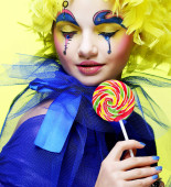 Młoda kobieta z kreatywną twarzą z lizakiem. Impreza i karnawał. Jasna peruka.