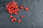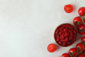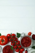 Drewniana miska z pastą pomidorową i pomidorami na białym stole teksturowanym