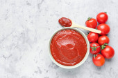 Miska pasty pomidorowej i pomidorów na szarym, teksturowanym tle