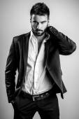 młody atrakcyjny człowiek w garniturze na szarym tle