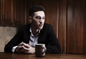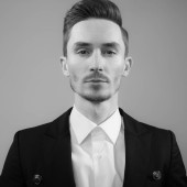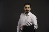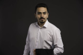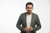 młody atrakcyjny człowiek w garniturze na szarym tle