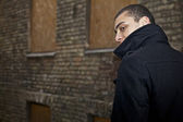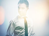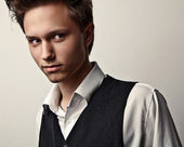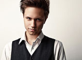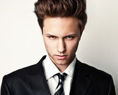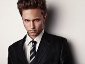 młody atrakcyjny człowiek w garniturze na szarym tle