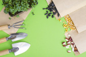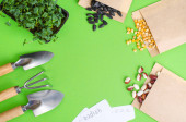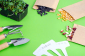 Wiosenne przygotowanie i planowanie do siewu warzyw. Nasiona warzyw w kopertach papierowych. Sezonowe prace ogrodowe. Studio zdjęcie