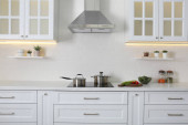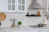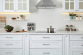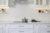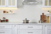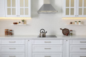 Eleganckie wnętrze kuchni z nowoczesną kuchenką i stylowymi meblami