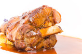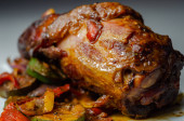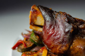 Staw bekonowy z kością podawany z grillowanymi warzywami, czerwoną i żółtą papryką, cukinią i czerwoną cebulą, tawerną żywnością
