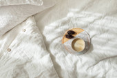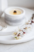 Kwitnące gałęzie moreli i płonąca świeca na okrągłej tacy we wnętrzu sypialni, dekoracja domu wiosna biały