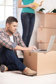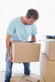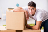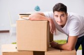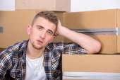 przygnębiony młody człowiek pochylony w tekturowym pudełku