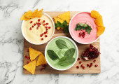 Różne pyszne hummuses na białym drewnianym stole, płaski leżak