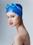 sportowiec z czerwonymi ustami w niebieskiej czapce kąpielowej i okularów patrząc w górę widok przycięty