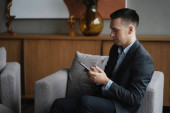 Zdjęcie "ciemnowłosy mężczyzna siedzi obok laptopa i trzyma telefon" może być wykorzystywane do celów osobistych i komercyjnych zgodnie z warunkami zakupionej licencji Royalty-free. Obraz jest dostępny do pobrania w jakości wysokiej rozdzielczości do 5760x3840.