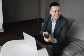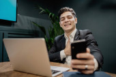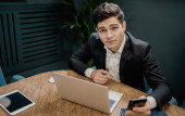 ciemnowłosy mężczyzna siedzi obok laptopa i trzyma telefon