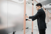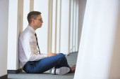 mężczyzna siedzi na podłodze w biurze, biznes formalny czarny su
