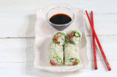 Zdrowe chrupiące quinoa Maki z ładnym talerzem powiedzieć sos