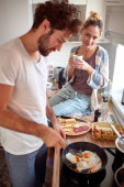 piękny młody kaukaski para zabawy w kuchnia co śniadanie śpiew, żart
