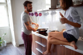 Zdjęcie "piękny młody kaukaski para zabawy w kuchnia co śniadanie śpiew, żart" może być wykorzystywane do celów osobistych i komercyjnych zgodnie z warunkami zakupionej licencji Royalty-free. Obraz jest dostępny do pobrania w jakości wysokiej rozdzielczości do 5760x3840.