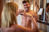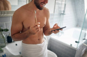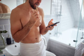 zbliżenie młody dorosły biały mężczyzna tułów, trzymając jego telefon komórkowy i szczoteczkę do zębów w łazience, pół nagi
