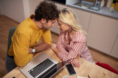 Zdjęcie "Młoda para przytulająca się podczas pracy w domu, opierająca się o siebie, uśmiechająca się. Praca w domu, covid 19, blokada, walentynki, koncepcja izolacji" może być wykorzystywane do celów osobistych i komercyjnych zgodnie z warunkami zakupionej licencji Royalty-free. Obraz jest dostępny do pobrania w jakości wysokiej rozdzielczości do 5760x3840.