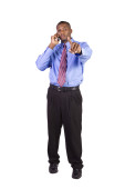 na białym tle biznesmen czarny z ręką w kieszeni rozmawia przez telefon