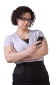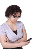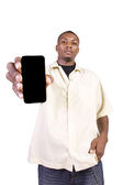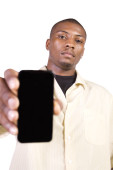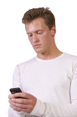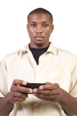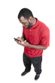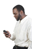 mężczyzna na białym tle czarny dorywczo SMS na swój telefon komórkowy