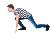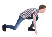 Równoważenie młody człowiek w kurtkę. widok z tyłu. na białym tle nad białym.