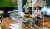 Matka bawi się z córką, podczas gdy ojciec pracuje we własnej kawiarni