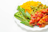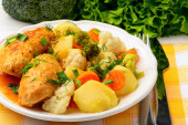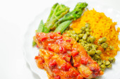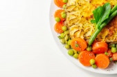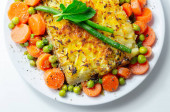 Ciasto pasterskie, delikatna mielona jagnięcina z warzywami ogrodowymi w obfitym sosie pod masłem puree z marchewką i zielonym groszkiem, tradycyjny brytyjski posiłek
