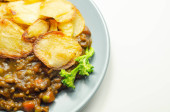 Hot pot z mielonej wołowiny, miękka brytyjska wołowina w rozgrzewającym sosie z marchwi i groszku, wszystkie zwieńczone pokrojonymi pieczonymi ziemniakami, klasyczny posiłek