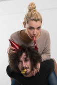 Dwóch kreatywnych pracowników biurowych współpracuje ze sobą, żartując sobie podczas pracy w biurze.