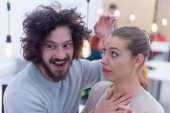 Zdjęcie "Dwóch kreatywnych pracowników biurowych współpracuje ze sobą, żartując sobie podczas pracy w biurze." może być wykorzystywane do celów osobistych i komercyjnych zgodnie z warunkami zakupionej licencji Royalty-free. Obraz jest dostępny do pobrania w jakości wysokiej rozdzielczości do 5760x3840.