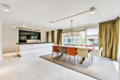 Zdjęcie "Przestronna jadalnia i miejsce pracy" może być wykorzystywane do celów osobistych i komercyjnych zgodnie z warunkami zakupionej licencji Royalty-free. Obraz jest dostępny do pobrania w jakości wysokiej rozdzielczości do 5760x3840.