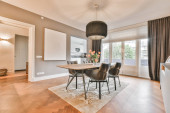 Zdjęcie "Jadalnia z białymi meblami w nowoczesnym apartamencie" może być wykorzystywane do celów osobistych i komercyjnych zgodnie z warunkami zakupionej licencji Royalty-free. Obraz jest dostępny do pobrania w jakości wysokiej rozdzielczości do 5760x3840.