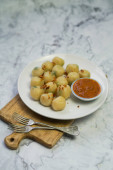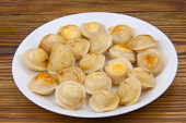 Smażone pierogi z kwaśną śmietaną i przyprawami na białym talerzu