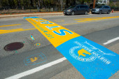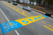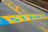 2019 Boston Marathon Start Line on Main Street in town of Hopkinton, Massachusetts MA, USA.