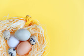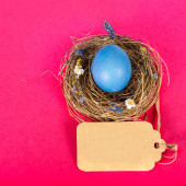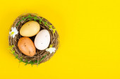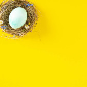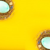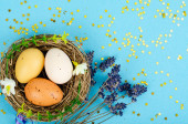 Gniazdo z jasno barwionymi jajkami z maskami medycznymi na niebieskim tle, miejsce na tekst. Święta wielkanocne podczas pandemii koronawirusowej. Studio zdjęcie