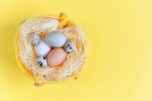 Zdjęcie "Gniazdo z jasno barwionymi jajkami z maskami medycznymi na niebieskim tle, miejsce na tekst. Święta wielkanocne podczas pandemii koronawirusowej. Studio zdjęcie" może być wykorzystywane do celów osobistych i komercyjnych zgodnie z warunkami zakupionej licencji Royalty-free. Obraz jest dostępny do pobrania w jakości wysokiej rozdzielczości do 5760x3840.
