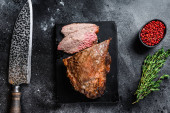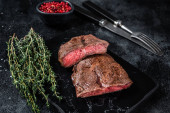 Zdjęcie "Grillowane górne ostrze lub płaskie steki z pieczonej wołowiny na marmurowej desce. Czarne tło. Widok z góry" może być wykorzystywane do celów osobistych i komercyjnych zgodnie z warunkami zakupionej licencji Royalty-free. Obraz jest dostępny do pobrania w jakości wysokiej rozdzielczości do 5760x3840.
