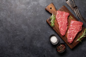 Zdjęcie "Świeże Surowe Ostrze lub płaskie steki z wołowiny na desce rzeźniczej. Czarne tło. Widok góry. Przestrzeń kopiowania" może być wykorzystywane do celów osobistych i komercyjnych zgodnie z warunkami zakupionej licencji Royalty-free. Obraz jest dostępny do pobrania w jakości wysokiej rozdzielczości do 5760x3840.