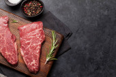 Świeże Surowe Ostrze lub płaskie steki z wołowiny na desce rzeźniczej. Czarne tło. Widok góry. Przestrzeń kopiowania