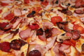 Makrofotografia pizzy zbliżenie jako tło. Makrofotografia żywności. fast food dostawy pomidorów