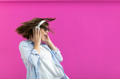 brunetka lady w czarny okulary taniec i słuchanie muzyka izolować na różowy tło