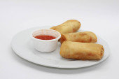 Jajko Ciasto francuskie wypełnione pikantnym i smacznym masala jajka i umieszczone na białej zastawy stołowej z sosem pomidorowym jako danie boczne na białym teksturowanym tle, izolowane.