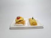 Jajko Ciasto francuskie wypełnione pikantnym i smacznym masala jajka i umieszczone na białej zastawy stołowej z sosem pomidorowym jako danie boczne na białym teksturowanym tle, izolowane.