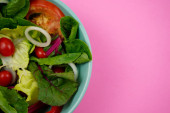 Zdjęcie "Sałatka warzywna. Wegańskie, wegetariańskie zdrowe, dietetyczne posiłek odżywczy w zielonej misce na szarym tle papieru. Sałata, cebula w plasterkach, pomidor, romańska lub kokosowa sałata i szwajcarska chard w składnikach podstawowych." może być wykorzystywane do celów osobistych i komercyjnych zgodnie z warunkami zakupionej licencji Royalty-free. Obraz jest dostępny do pobrania w jakości wysokiej rozdzielczości do 5760x3840.