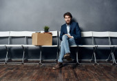 Biznesmen w garniturze siedzi na białej sofie w jasnym pokoju, widok z boku